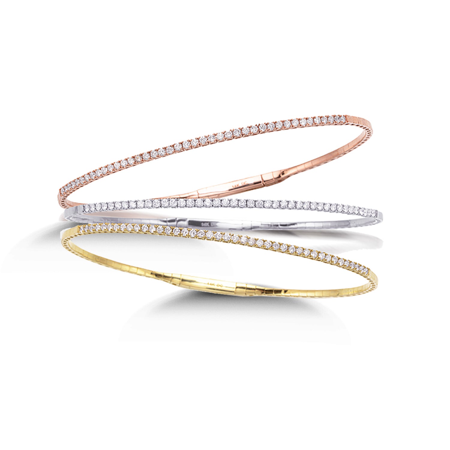 Diamond flexible bangle with diamonds half way around set in 14kt yellow gold. Diamond weight = 0.62cts. Natural, round brilliant cut diamonds. Clasp closer that opens and closes.