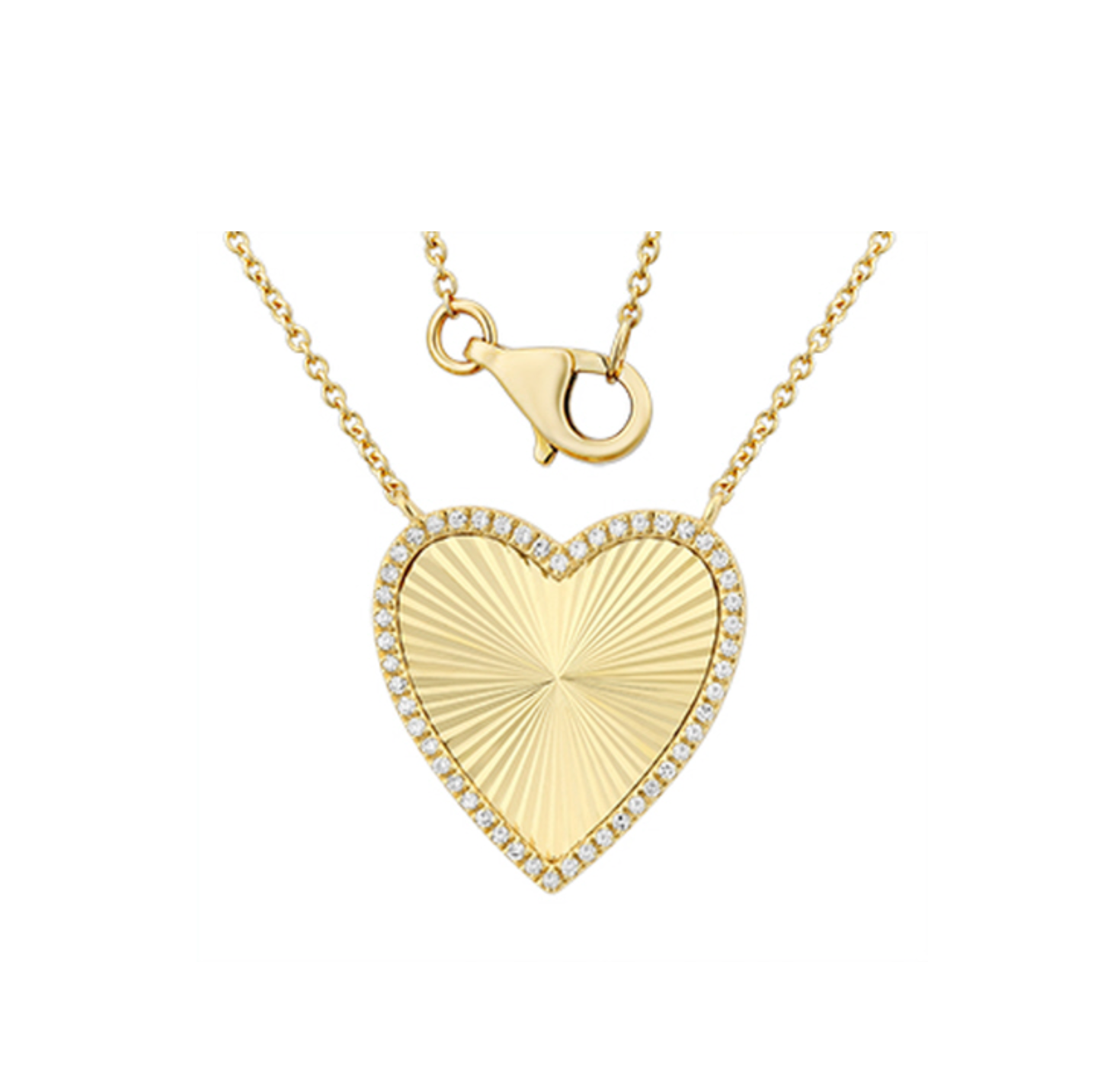 Diamond fluted heart necklace with prong setting on a link chain set in 14kt yellow gold. Diamond weight = 0.11cts. Natural, round brilliant diamonds. 16 inches long. Pendant is not removable from the chain.