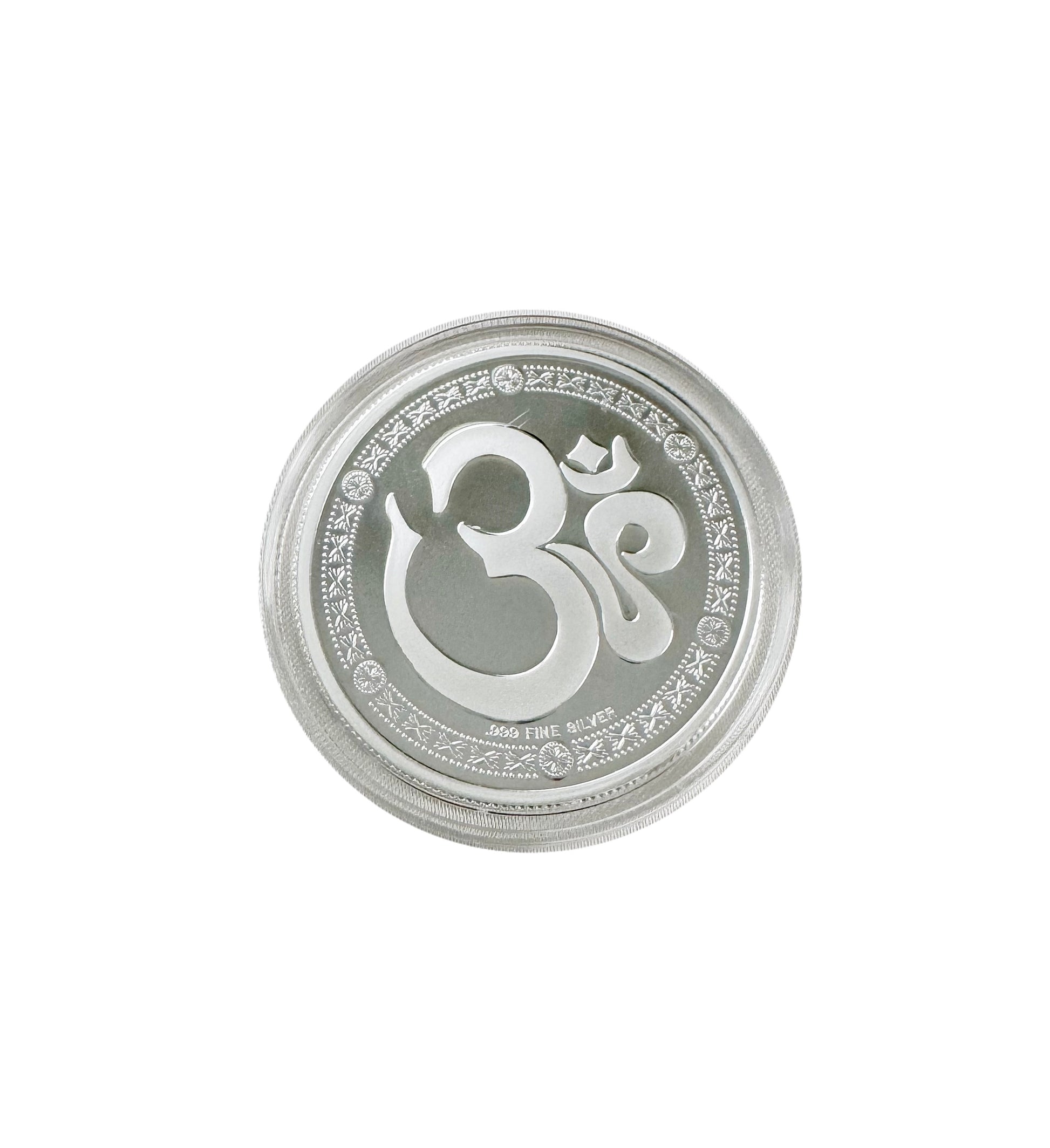 Pure silver coin with Ganesh Ji on one side, and the Hindu symbol OM on the other side. Minted right here in the US, and come in an airtight plastic case which prevents tarnishing for many years. Pure silver (.999), 1oz coin, 39mm in diameter.